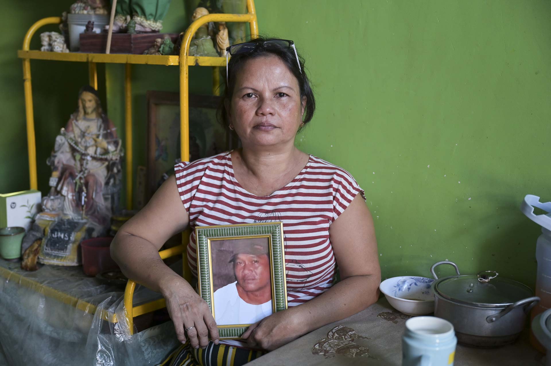 Rowena Panotes hält das gerahmte Foto ihres Mannes in die Kamera.